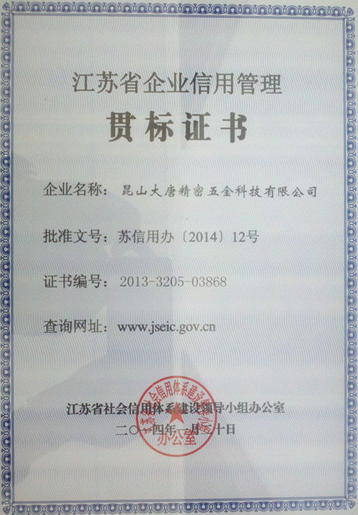 荣获江苏省企业信用管理贯标证书